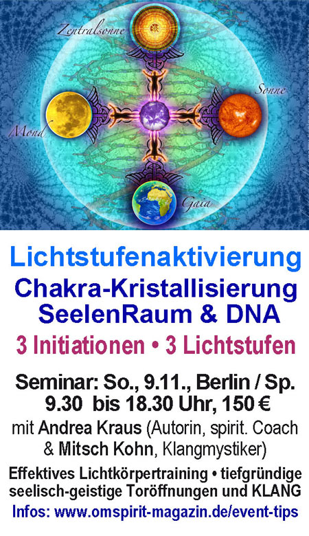Am 9.11. findet ein Intensiv-Lichkörperseminar der Heilerin Andrea Kraus (Autorin der beiden „Lichtkörpersymptome“-Bücher) und mir in Berlin statt.