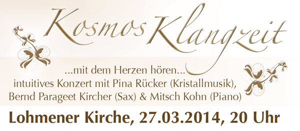 Parageet Bernd Kircher (Sopran- & Altsaxophon), Pina Rücker (Krstallklangschalen) und Mitsch Kohn (Piano) laden zu einer intuitiven Klangreise in die Lohmener Kirche (nahe Dresden / Pirna ) ein.